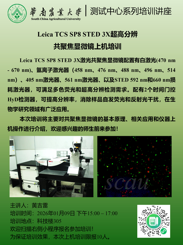 测试中心系列培训讲座(2026年第1期):Leica TCS SP8 STED 3X超高分辨共聚焦显微镜上机培训